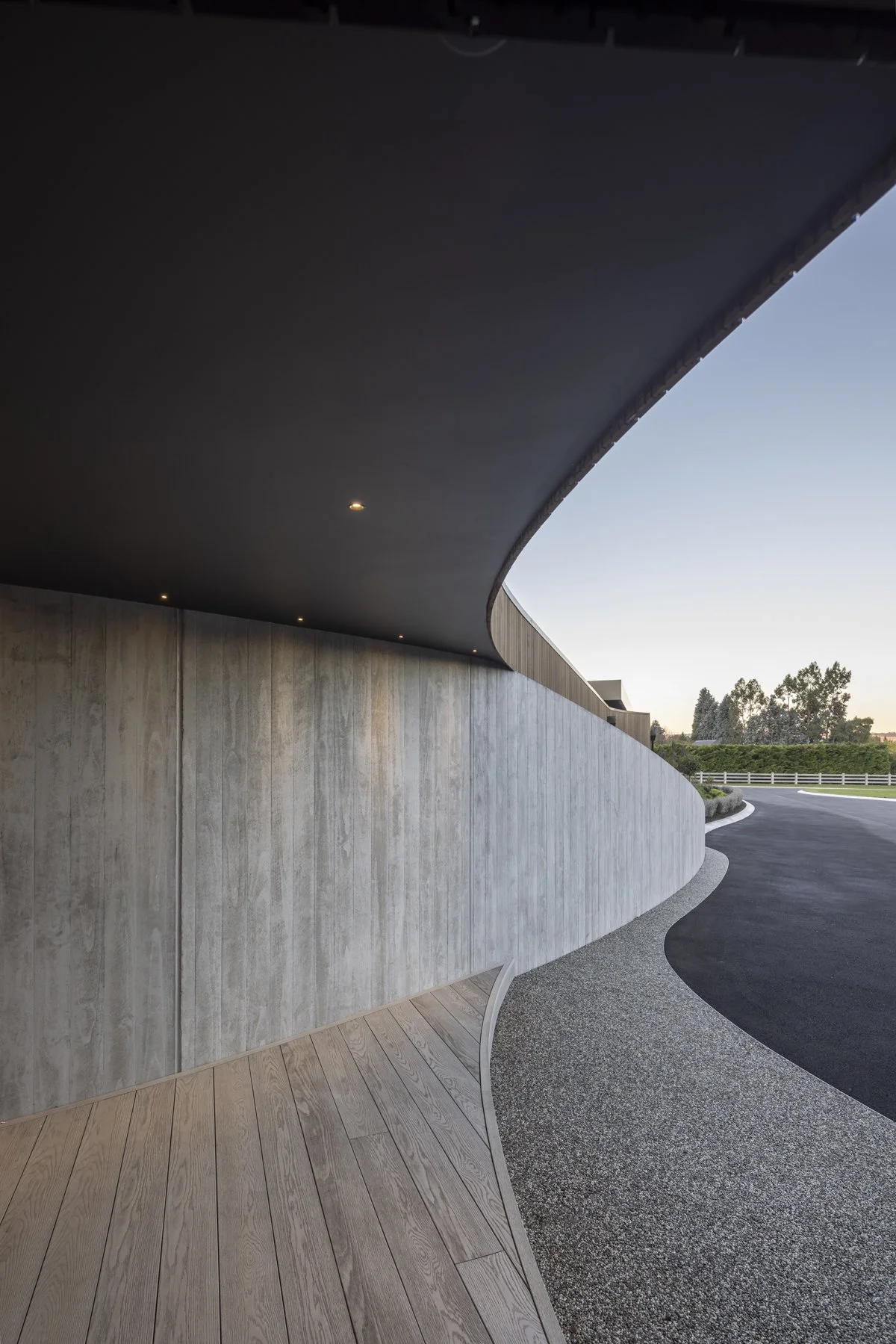 Modern building with curved concrete wall, black ceiling, wooden flooring, a gravel pathway, and an asphalt road, with trees in the background.